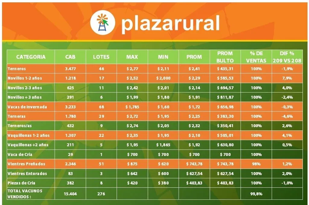 En su 209° remate por pantalla Plaza Rural puso sobre la pista, desde el hotel Cottage, 15.440 vacunos y 802 ovinos certificados que fueron colocados casi en su totalidad –finalmente se vendió el 99,8% del total–, en un remate que tuvo un muy buen nivel dado también por la calidad de los ganados ofrecidos.