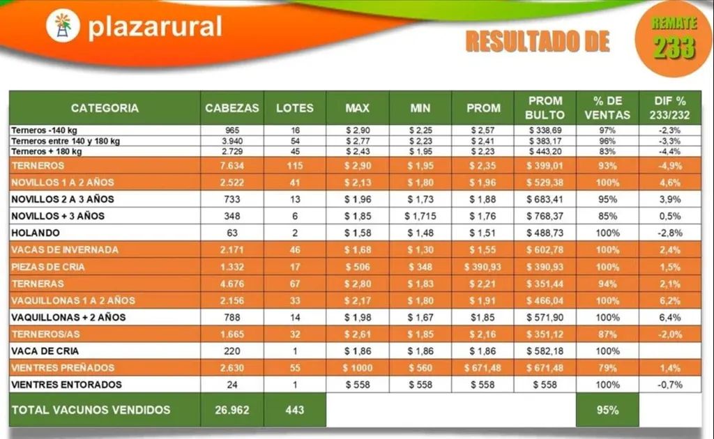 Álvaro García, presidente de Plaza Rural, comentó a El Observador que el remate N° 233 de este consorcio, que tuvo como atractivo adicional a una nueva Plaza Braford, “anduvo muy bien, en cuatro jornadas se vendió el 95% de una oferta de casi 27.000 cabezas”, alcanzándose el 100% en varias categorías.