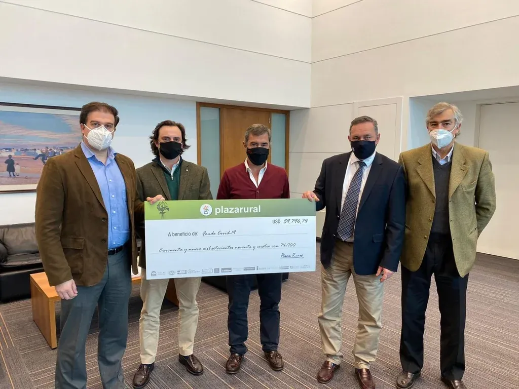 El jueves 6 integrantes de Plaza Rural entregaron al gobierno un cheque de casi US$ 60 mil para el Fondo Coronavirus, que se destinará a la compra de carne para comedores del Instituto Nacional de Alimentación. En total el consorcio recaudó US$ 120 que se enviaron en diferentes fases.