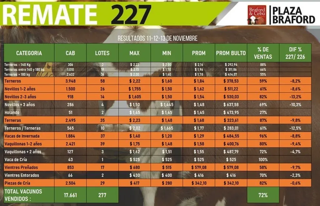 Como se puede apreciar en el cuadro de precios y porcentajes de colocación, hubo categorías en las que la demanda captó apenas poco más de la mitad de la oferta, pero en otros casos compró casi todo lo que se propuso por parte de los distintos rematadores.