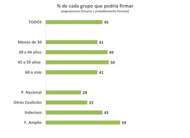 En cuanto a preferencias partidarias, los votantes del Frente Amplio son quienes tienen más predisposición a firmar: el 59% de este electorado. "Casi 6 de cada 10 tienen una intención primaria de firmar", informó la encuestadora.