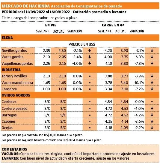 En lanares se da una corrección estacional de precios. Hay un alza de la oferta. Las cotizaciones siguen en baja y esta semana rondan los US$ 3,30 para el capón y US$ 4 para el cordero, con entradas de mediados de octubre en adelante.