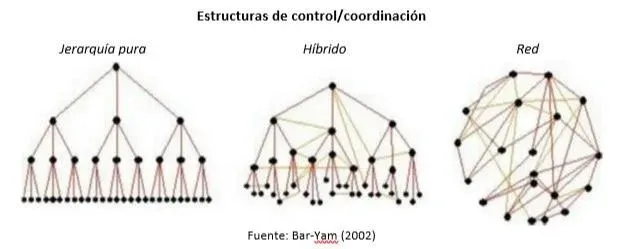 La estructura tradicional de coordinación en el sector público es la jerarquía, esto es, una organización especializada horizontal y verticalmente, en la cual la separación de los asuntos en un nivel determinado implica que la responsabilidad de coordinación está en un nivel superior (véase, Figura). La esencia de la jerarquía es que permite a un único agente -la cabeza- controlar los comportamientos de gran escala de la organización. En consecuencia, estos comportamientos no pueden ser más complejos que el agente que está a la cabeza y el nivel de complejidad que puede manejar una organización jerárquica es, necesariamente, limitado.