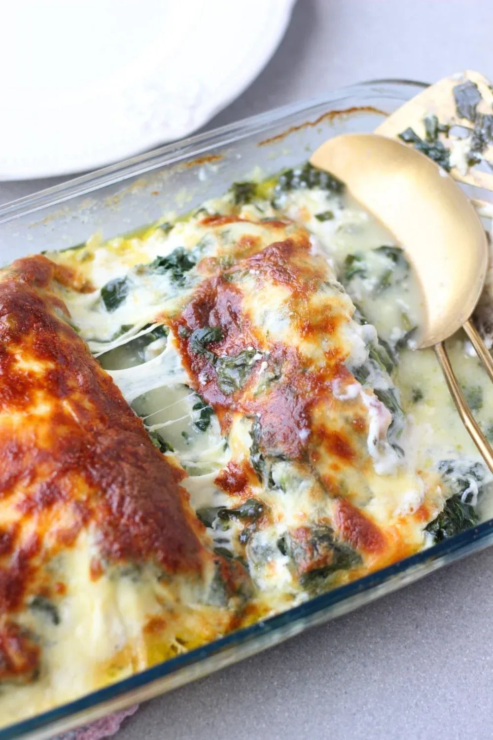 Imagínense lo siguiente… En el horno, el pollo, bien condimentado, se va cocinando a la temperatura justa mientras que la espinaca y el queso crema se van mezclando a medida que este se derrite. El queso muzzarella, por encima de todos ellos, es el toque maestro y el que luego, en la mesa, formará hilos de queso fundido del tenedor a la boca. El gratinado es, en mi opinión, algo fundamental.