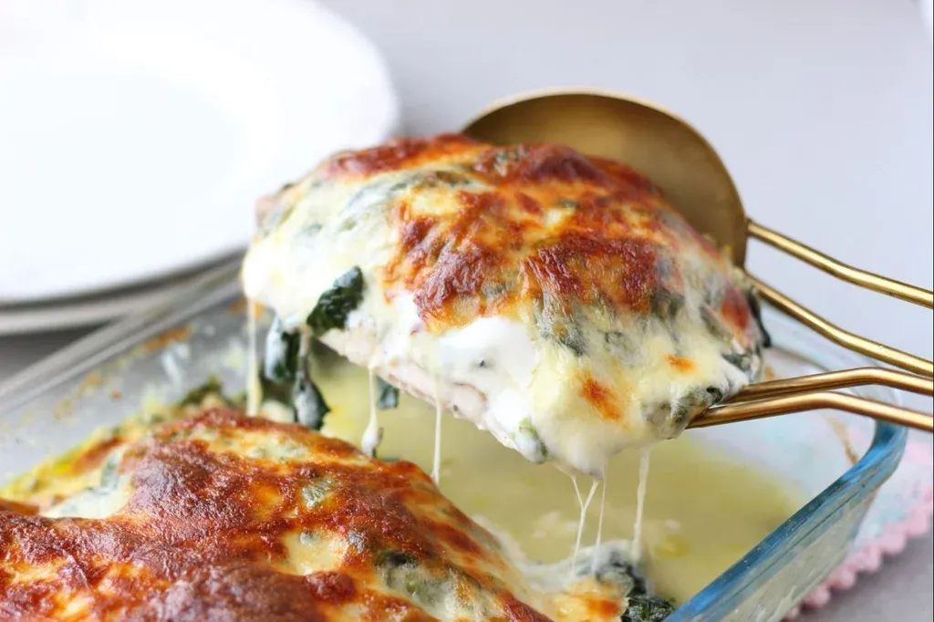 Pollo al horno con espinaca, queso crema y muzzarella gratinada