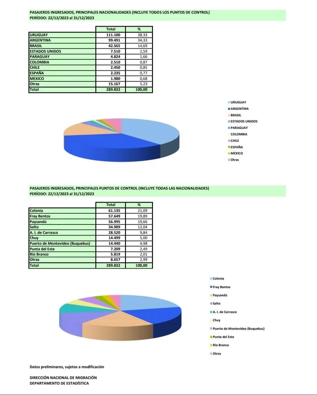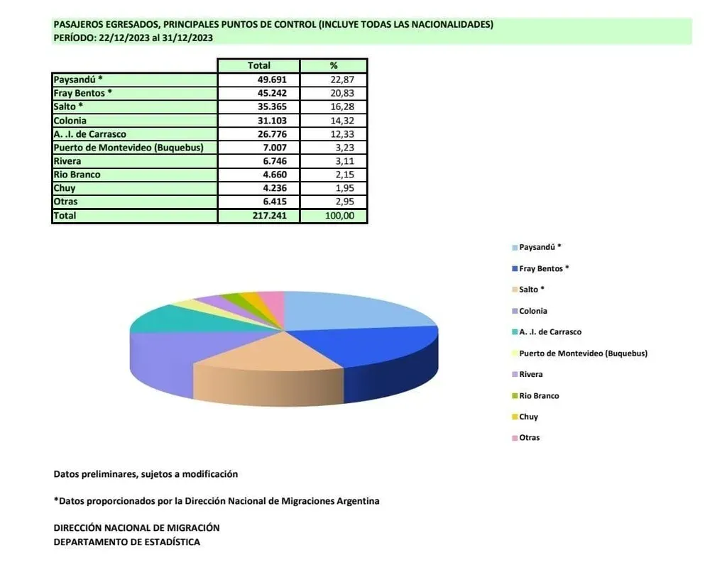 Respecto a los egresos durante este plazo, Migración contabilizó que 217.241 personas salieron del país. Lo hicieron por Paysandú, Fray Bentos, Salto, Colonia, Aeropuerto de Carrasco y Puerto de Montevideo.