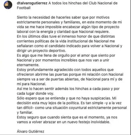 Y agrega: "En los últimos días tuve el inmenso honor de que distintas corrientes políticas de la vida institucional de Nacional me señalaran como el candidato indicado para volver a Nacional y dirigir un proyecto deportivo. Es algo que me llena de orgullo por el amor que siento por Nacional y por momentos increíbles que nos van a unir eternamente".