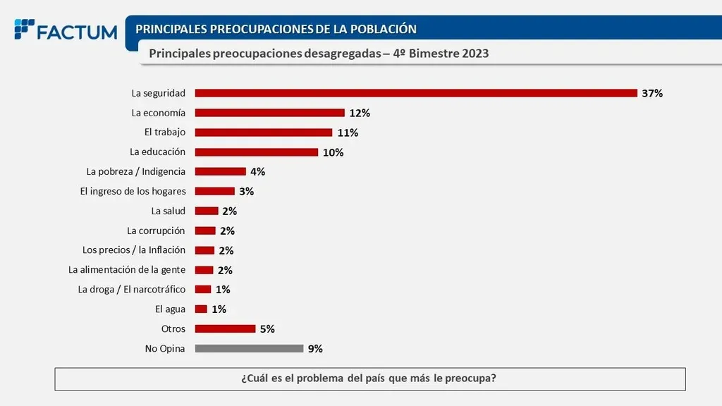 Le siguen a esos asuntos mencionados la pobreza e indigencia (4%), el ingreso de los hogares (3%), la salud (2%), la corrupción (2%), los precios y la inflación (2%), la alimentación de la gente (2%), la droga y el narcotráfico (1%) y el agua (1%). Otro 5% mencionó otros problemas y 9% dijo que no opinaba.