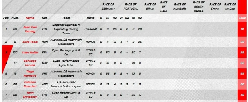 Cumplidas cuatro carreras de 16, el líder del Campeonato Mundial es Jean Karl Vernay (Hyundai) con 61 puntos seguido de Attila Tassi (Honda), Muller (Lynk & Co) y Urrutia los tres con 56 puntos pero se define el segundo, tercero y cuarto lugar por el mejor resultado hasta ahora: Tassi tiene una victoria, Muller un segundo puesto y Urrutia un tercer puesto. Por detrás del uruguayo se coloca el portugués Tiago Monteiro (Honda) con 52 y quinto el argentino Esteban Guerrieri también con 52.