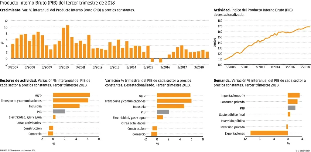 El Producto Interno Bruto (PIB) de Uruguay se mantuvo sin cambios en el tercer trimestre respecto al segundo cambio del año, medido en términos desestacionalizados –sin considerar las variaciones normales atribuibles a la altura del calendario–, según los datos divulgados este jueves por el Banco Central (BCU).