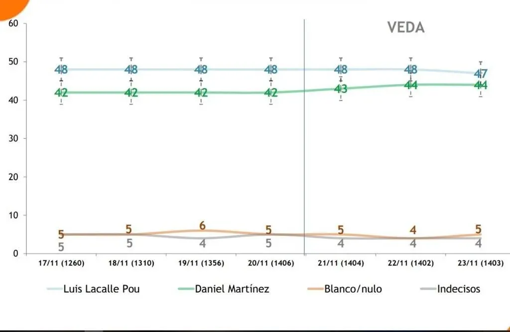 Consultado por El Observador, dijo que es "difícil interpretar" los motivos por los cuales la brecha se acortó. Durante la veda, Lacalle Pou perdió un punto y Martínez ganó dos, según Equipos. El miércoles, antes de la veda, Lacalle Pou tenía 48% de proyección de votos; y Martínez, 42%. Mientras que el sábado los porcentajes pasaron a ser 47% y 44%, respectivamente.
