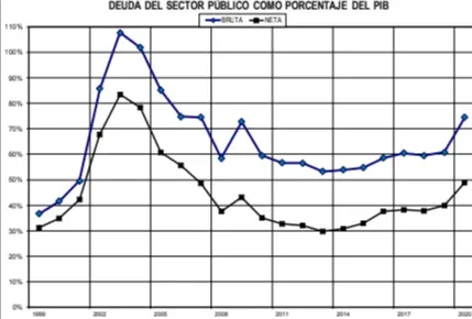 El endeudamiento total del sector público de Uruguay cerró el 2020 en US$ 39.938 millones, o 74,5% del PIB. Al descontar de esa cifra a los activos externos del sector público (excluidos los encajes que, aunque contingentes también son pasivos) y a los activos con residentes, se llega a una deuda neta de US$ 26.144 millones, o 48,7% del PIB.