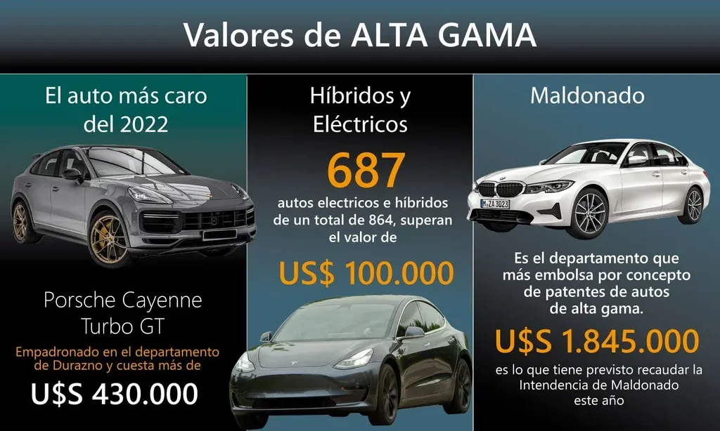 Montevideo y Maldonado tendrán más de 600 autos de alta gama cada uno recorriendo su territorio en 2023. Muy lejos aparece Canelones, con 127 vehículos lujosos empadronados en esa jurisdicción, seguidas de San José y Colonia con 38 cada uno. En todos los departamentos, sin distinción, están circulando autos o camionetas que valen más de US$ 100 mil.