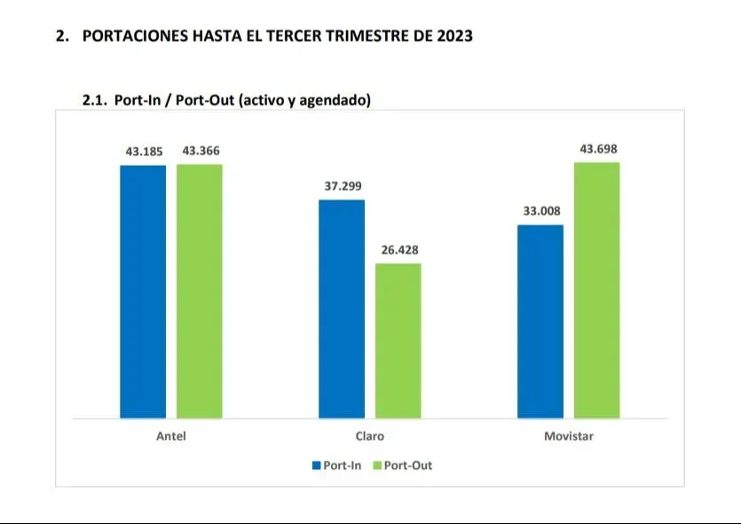 Al cierre del tercer trimestre se habían registrado 297.500 solicitudes de portación. De ese total, 113.286 portaciones se realizaron con éxito, 123.575 fueron rechazadas por la compañía donante, 52.642 fueron rechazadas por el Administrador de la Base de Datos (ABD), y 7.380 fueron de líneas no activas.