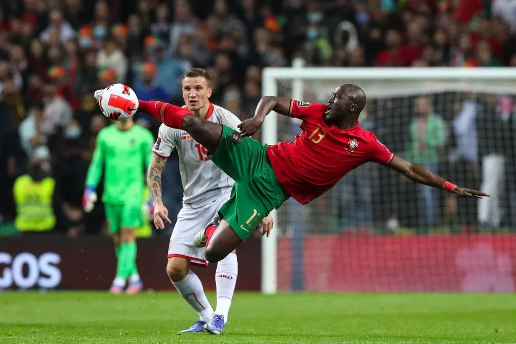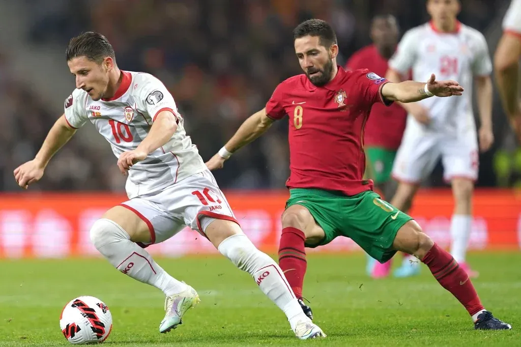 Joao Moutinho de Portugal, marca a Bardhi de Macedonia del Norte en el encuentro del pasado martes cuando lograron clasificarse a la Copa del Mundo de Catar 2022
