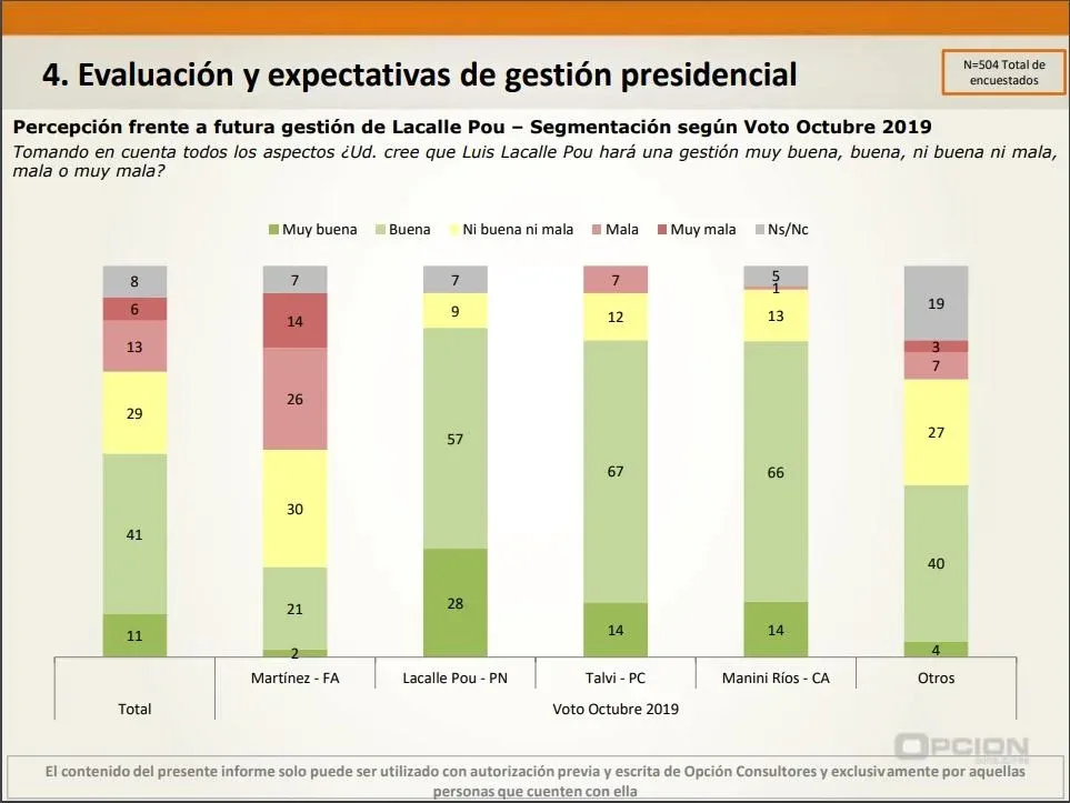 La conclusión más importante es que los votantes del Partido Nacional, evidentemente, tienen el mayor sesgo positivo hacia la gestión. Lo que crece es el verde oscuro de la gráfica, es decir los que dicen que va a ser muy buena la gestión. En términos generales la expectativa de gestión es similar, solo que entre los blancos hay más preponderancia del "muy buena", mientras que colorados y cabildantes prevalece el "buena".