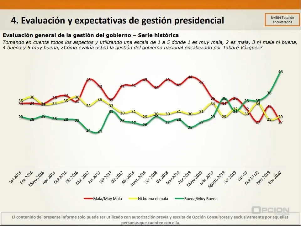 Estamos en el período de luna de miel. No es sorprendente en relación a lo que muestran transiciones anteriores. Se suele observar en los gobiernos salientes de regímenes presidencialistas un efecto rebote en la aprobación. En el caso de Vázquez ocurre un poco después de lo previsible, a partir del segundo semestre de 2019. Por otro lado Lacalle Pou, como la mayoría de los presidentes en Uruguay –sobre todo a partir de la victoria de Jorge Batlle–, inicia la gestión con espalda ancha en términos de opinión pública. Si bien el voto en primera vuelta fue de 29%, con el voto de segunda preferencia sumó unos 20 puntos más y hoy 52% de la población cree que su gestión será buena o muy buena.