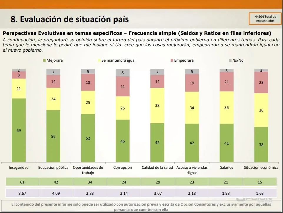 Hay varias conclusiones importantes. Evidentemente, las opiniones de multicolores y frentistas son muy diferentes. Los frenteamplistas son mucho más escépticos y negativos; los votantes de la coalición multicolor son mucho más esperanzados en una buena gestión. En los dos casos el principal indicador que creen que va a mejorar es la inseguridad y el que menos creen que va a mejorar son los salarios. Pero entre los frentistas pasa algo más. La inseguridad es el único indicador donde las expectativas positivas superan a las expectativas negativas. En los multicolores se da en todos los indicadores. En el Frente es el único y eso es bien interesante. Los frentistas le dan más crédito al gobierno en seguridad que en economía y salarios. Es probable que exista un segmento de electores frenteamplistas que en una gran mayoría de dimensiones ideológicas y de política pública sintoniza con el FA pero que en el asunto de la seguridad hoy por hoy sintoniza un poco más con las propuestas de la coalición multicolor.