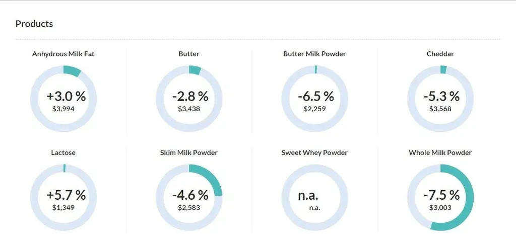La baja según el índice global de precios de los productos lácteos en la primera subasta de agosto (evento N°265 de la plataforma Global Dairy Trade – Fonterra_) ubicó al promedio de todos los lácteos negociados en US$ 3.045 la tonelada.
