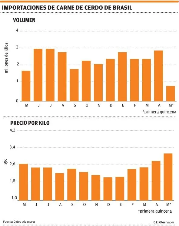Pese a la suba de más de US$ 1 por kilo las compras de cerdo en Brasil no se moderaron en los primeros cuatros meses y oscilaron entre los 2,5 y 3 millones de kilos. Sin embargo, en la primera quincena de mayo se nota una baja ya que las importaciones no llegan a 1 millón de kilos.