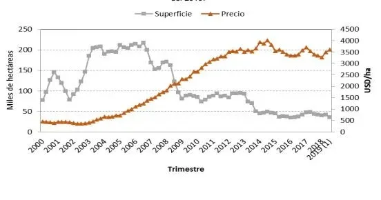 El valor máximo por ha se alcanzó en 2014 con una cotización de US$/ha 3.924, y el piso (previsible) durante la crisis de 2002 con apenas US$/ha 386 como valor medio. Desde el segundo trimestre de 2008, el precio medio trimestral, tomando trimestres móviles, se ha ubicado siempre por encima del promedio general del período (ver gráfico).