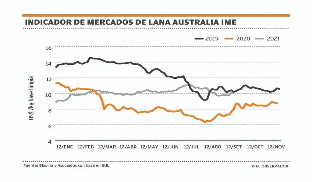 Hasta agosto Uruguay exportó 20,8 millones de kilos de lana equivalente base sucia, 65% más que los 7,2 millones de kilos vendidos en enero-agosto 2020.