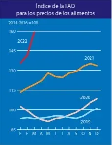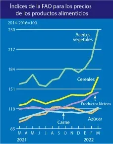 El precio de los alimentos que mide mes a mes la Organización de las Naciones Unidas a través de la FAO marcó en marzo un nuevo récord por lo alto. El pan y sobre todo el aceite son los que se disparan de una manera nunca vista antes. Por más que a lo largo de este siglo el precio alto e inédito se ha vuelto la norma. Con un clima más inestable, cientos de millones de personas accediendo a los niveles de consumo de las clases medias, crecimiento poblacional persistente y urbanización que lleva a cambios en la dieta con más proteínas y fritos consumidos, es difícil ver como los precios pueden bajar.