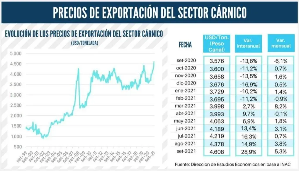 En setiembre de 2021, el precio promedio de exportación del sector cárnico fue de US$ 4.608 por tonelada, cotización 28,9% mayor a la registrada en el mismo mes del año anterior y registrando un incremento del 5,3% en comparación con agosto de 2021.