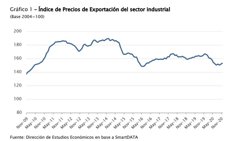 El Índice de Precios de Exportación (IPE) del sector industrial medido en dólares tuvo una caída interanual de 8,1% en noviembre, pero aumentó 1% en relación a octubre, según el informe de la Cámara de Industrias del Uruguay.