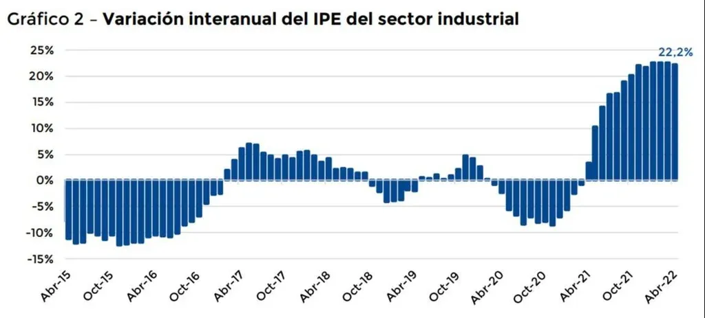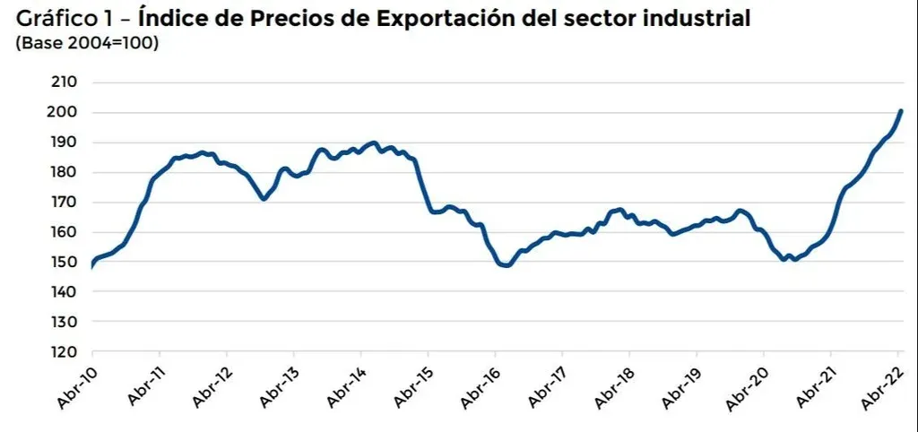 En el sector industrial, el IPE en dólares creció 2,5% respecto al mes anterior y aumentó 22,2% si se compara con abril de 2021. Estos niveles de precios de exportación marcan un récord histórico de la última década ,según la CIU.