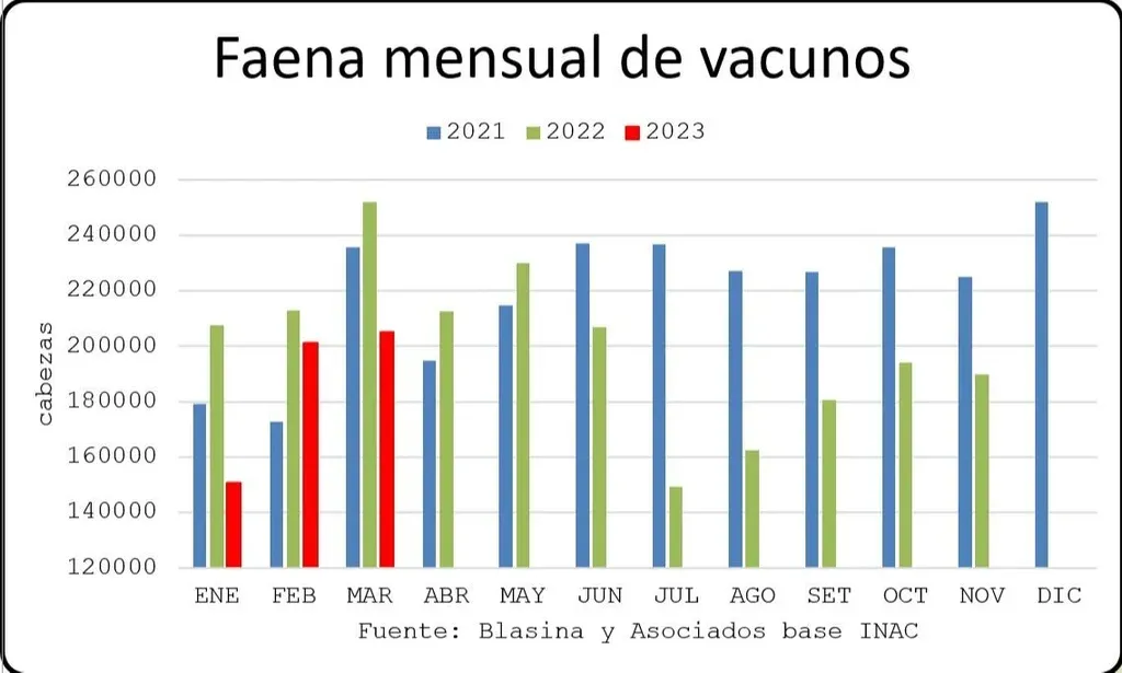 El volumen de vacunos faenado en marzo cruzó las 200.000 cabezas por segundo mes consecutivo, algo que no se daba desde mayo/junio de 2022.