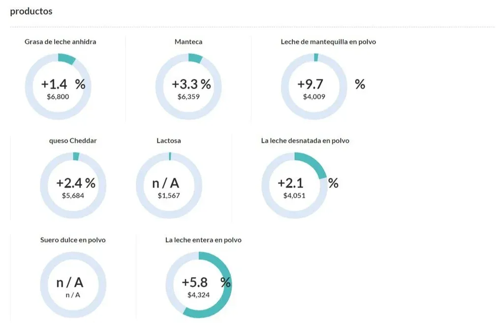 En la lectura por subrubros, en el caso de la leche en polvo entera (WMP), que es el producto lácteo de mayor volumen en las colocaciones externas de Uruguay, el precio promedio tuvo esta vez una suba de 5,8%, al pasar el valor de referencia a US$ 4.324 por tonelada.