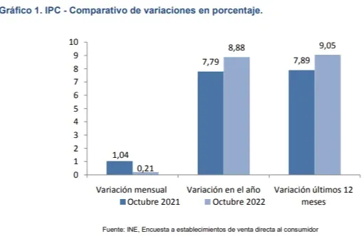 Por otro lado, el INE informó que el IPC de octubre 2022 fue el último boletín que se publica con la base 2010. El boletín correspondiente a noviembre, que se publicará el día 5 de diciembre, informara las variaciones del IPC con la nueva base octubre 2022=100.