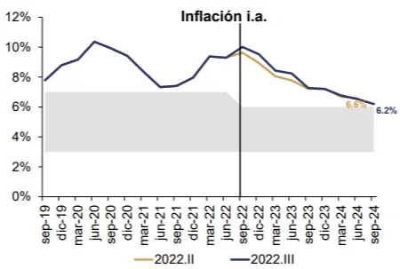 En ese ese marco, en hacia el final del horizonte de política monetaria (setiembre de 2024), la inflación se ubicaría en 6,2%, es decir, dos décimas por arriba del techo del rango meta (6%), y que se ingrese al rango sobre fines de ese año.