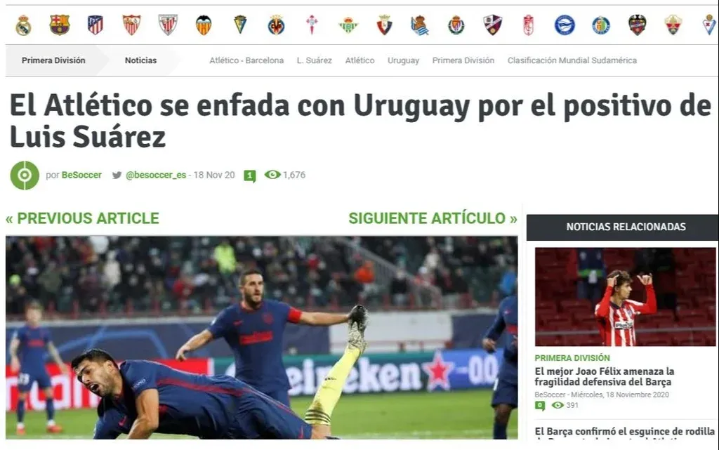 “Malestar en el Atlético por lo acontecido los últimos días respecto a Luis Suárez, delantero rojiblanco que dio positivo por covid-19 en la tarde del lunes”, expresó el citado periódico español.