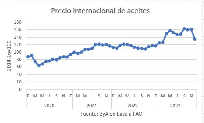 En el promedio global que lleva la FAO, el índice de precios de los aceites vegetales de la FAO se situó en 126,3 puntos tomando como base 100 el promedio 2014-16 en dólares corrientes, lo cual supone un acusado descenso (de 61,5 puntos o un 32,7 %) respecto de 2022 y el nivel más bajo de los últimos tres años, gracias al aumento de los suministros mundiales.