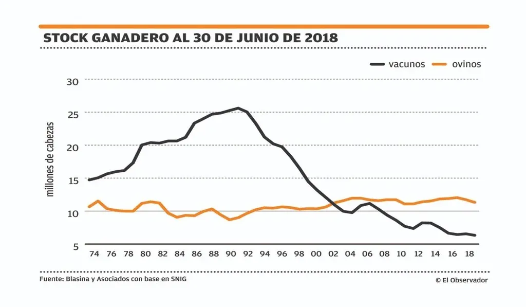 Los datos de stock ganadero en Uruguay al 30 de junio de 2018 marcaron un descenso, tanto en vacunos como en ovinos, mostrando cambios fuertes en la producción ganadera. A partir de los mismos se puede proyectar que caerá la faena en 2019 y 2020 y realzan la importancia del entore por venir: es imperioso que se produzcan más terneros. Y el stock ovino sigue cayendo pese a los buenos precios de la lana y la estabilidad de los de la carne.