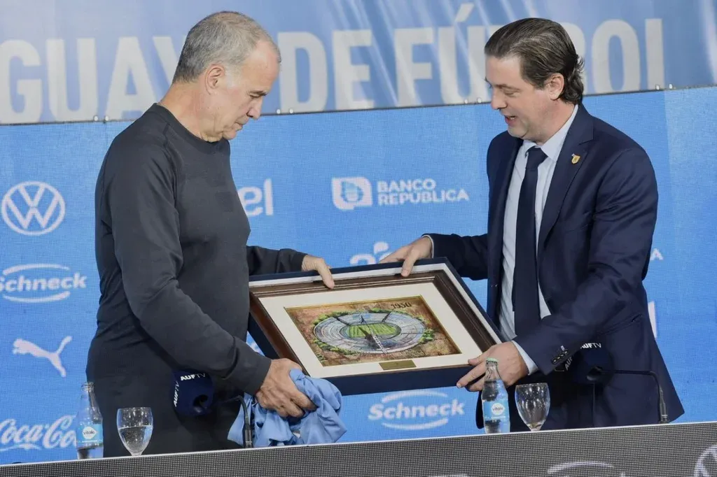 Marcelo Bielsa comenzó su presentación como nuevo entrenador de la selección uruguaya con un regalo que le hizo el presidente de la Asociación Uruguaya de Fútbol (AUF) Ignacio Alonso.