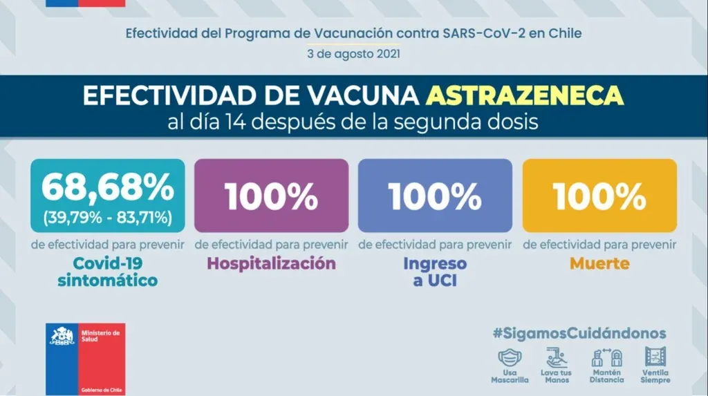 Los resultados en el caso de Astrazeneca reflejaron que es especialmente útil ante un curso grave de la enfermedad: tiene 68,68% de efectividad para prevenir el covid-19 sintomático, pero crece a 100% para prevenir hospitalizaciones, ingresos a CTI y fallecimientos. Esta vacuna no había sido evaluada en la versión anterior del estudio. Araos advirtió que el tiempo de seguimiento fue menor, por lo que los porcentajes se deben seguir monitoreando.