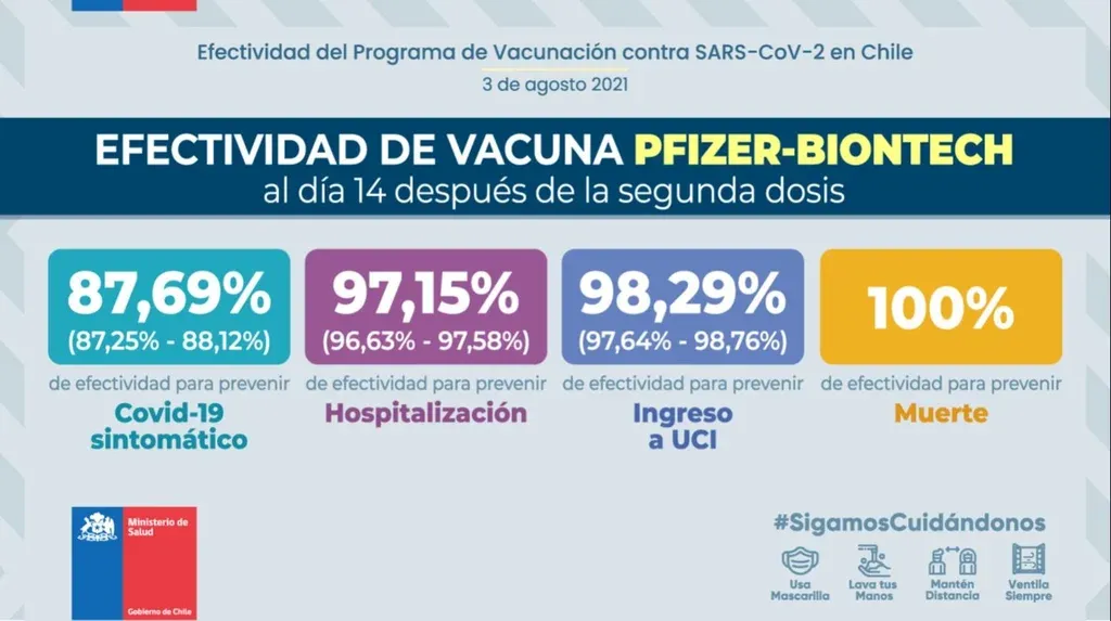 Según el investigador, los resultados revelan que la gente “puede estar tranquila con el pool de vacunas contra SARS-CoV-2 disponibles" en Chile, ya que son especialmente efectivas "para prevenir la hospitalización, ingreso a CTI y muerte por covid-19”. El estudio abarcó a más de 15,4 millones de personas totalmente vacunadas.