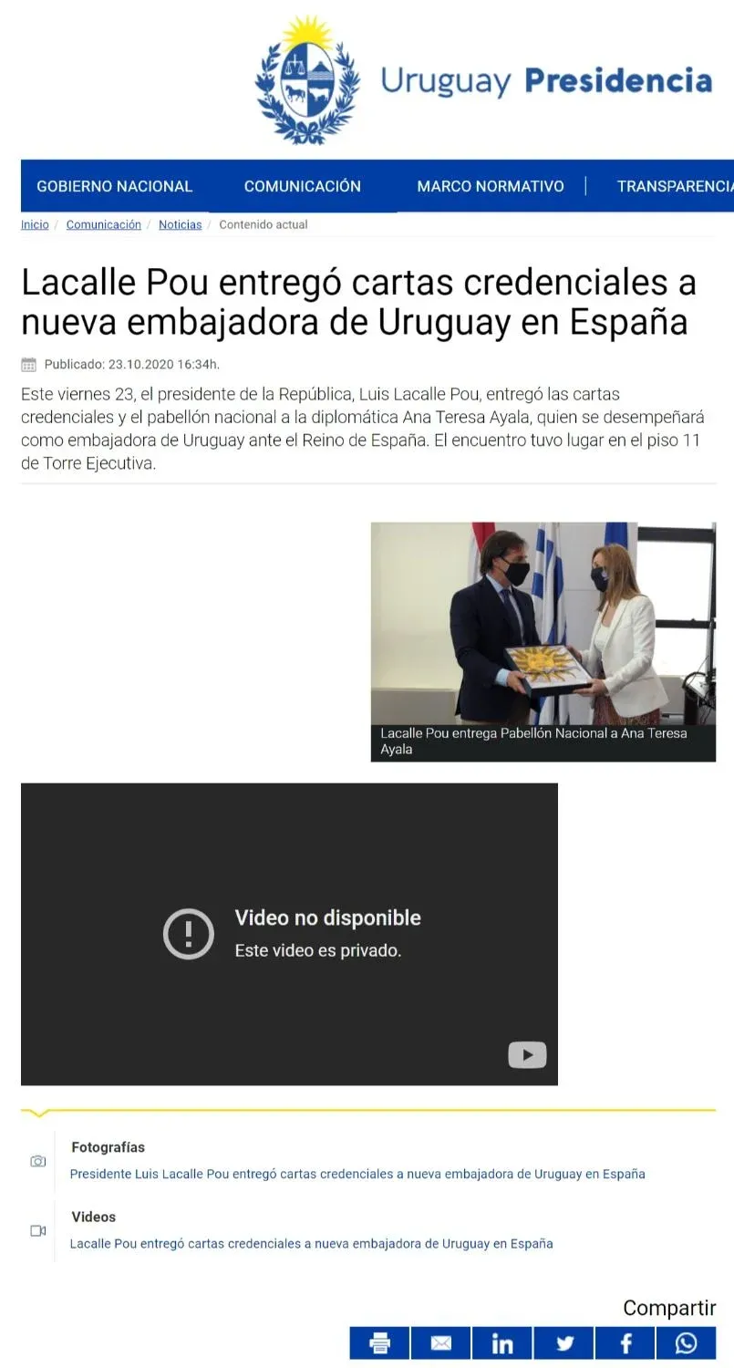 El lunes, una hora después de publicada esta noticia por parte de El Observador y cuando Lacalle tomó conocimiento del asunto, Presidencia volvió a dejar visible el video, tanto en su canal de Youtube como en su página web.