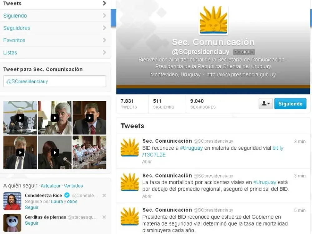 El Ministerio de Industria, Energía y Minería, por su parte, también mencionó en su memoria anual la gestión en la red social Twitter. Dice que luego de crear la cuenta institucional logró a diciembre de 2012 “más de 570 seguidores”.