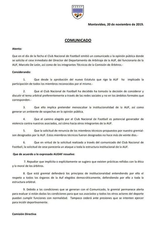 Por otra parte, como se informó a Referí, este miércoles AUDAF emitió un comunicado sobre el tema contestando “a las presiones que hizo públicas Nacional” y puntualizaron que “no se van a amedrentar” frente a estas situaciones.