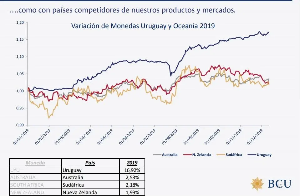 Dijo que si se toma en cuenta la evolución de las monedas de los demás países de la región y de los países competidores (Australia, Nueva Zelanda), “¿dónde está lo que llaman el atraso cambiario?”. Graña argumentó que si se ve la evolución de la moneda en el último año se puede ver que no hay un problema de atraso cambiario en Uruguay.