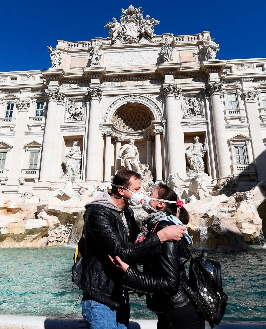 Hasta el amor es distinto en tiempos del coronavirus. En frente de la Fontana di Trevi en Roma, ahora ciudad desolada aunque eterna, esta pareja de turistas sella el momento con un beso insípido, quizás sea el recuerdo de su primer viaje a Italia, el país donde el impacto del coronavirus ha sido más alto con una tasa de mortalidad que más que duplica la de China. Sesenta millones de italianos están confinados en sus casas en cuarentena esperando que se cumpla la promesa del primer ministro Giuseppe Conte: "Lo lograremos, para que mañana podamos volvernos a abrazar". Y besar.