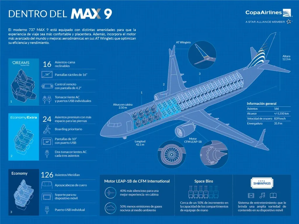 “El MAX 9 es un avión que significa eficiencia, seguridad y confort a la operación diversificada que ofrece Copa Airlines. Esta aeronave cuenta que la última tecnología en aviación comercial, permitiéndonos ser más amigables con el medioambiente y transportar a más pasajeros en nuestros vuelos de mayor alcance”, comentó Sonia Ortega, piloto capitana de Copa Airlines.