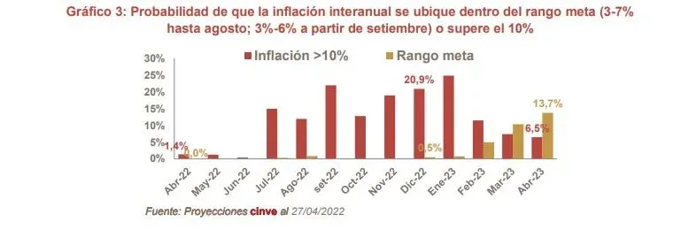 El informe sostiene que para el cierre de 2022 la probabilidad es de apenas 0,5% (desde un 2% en marzo), y presenta un aumento en los primeros meses de 2023 (llega a 13,7% en abril de es ese año), pero aclara que con la información disponible al día de hoy tampoco es probable que se cumpla el próximo año, explica el reporte.