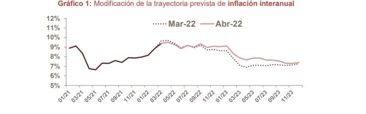 La inflación interanual se situó en 9,4% en el año móvil cerrado a marzo, superando la barrera del 9% por primera vez desde febrero de 2021. Se espera un incremento adicional de la inflación anual en abril, y una posterior tendencia bajista. La proyección puntual para la inflación durante el mes de abril es del 0,6% y entorno a 9 % hacia los meses finales del año, según Cinve.