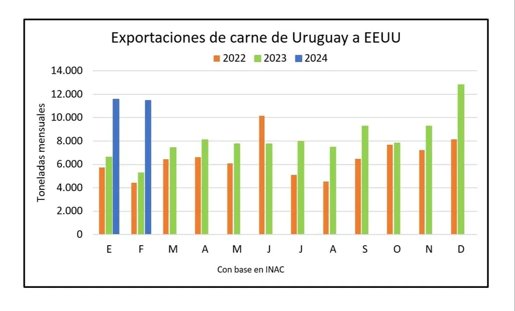 Las exportaciones de Uruguay a Estados Unidos crecieron 50% en diciembre de 2023 y dieron un salto de 94% en volumen en el primer bimestre de 2024: de 11.886 a 23.036 toneladas.