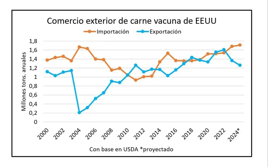 Parte de la competencia entre los exportadores del Mercosur cambia de escenario y se muda de China a Estados Unidos. En total las importaciones de carne de Estados Unidos en 2023 aumentaron un 10,2% respecto al año anterior y en 2024 crecerán otro 8,5%.